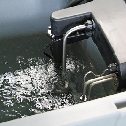 In onze ontvetterbak bevindt zich een detector, de PT 100, die ervoor zorgt dat de ontvetter op de juiste temperatuur blijft en automatisch uitschakelt bij een te laag vloeistofniveau. Om verstoringen in het proces te voorkomen, is het belangrijk altijd 1 of 2 cannen ontvetter op voorraad te hebben. Zo kunt u direct bijvullen wanneer het vloeistofniveau te laag is.